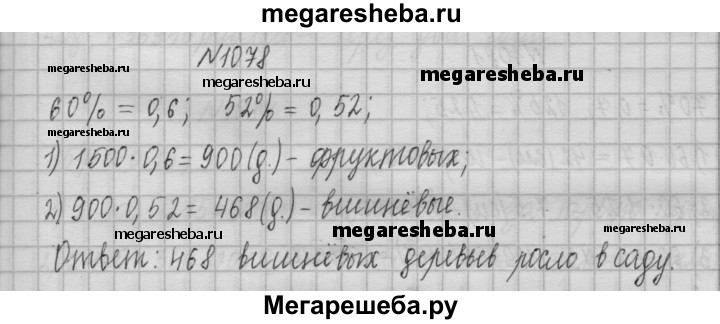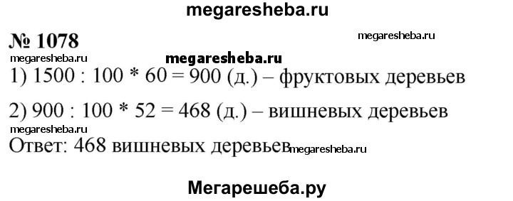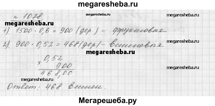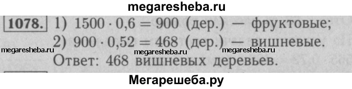 1078. В саду росло 1 500 деревьев, из них 60 % составляли фруктовые деревья. Вишнёвые деревья составляли 52 % фруктовых деревьев. Сколько вишнёвых деревьев росло в саду?
