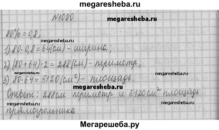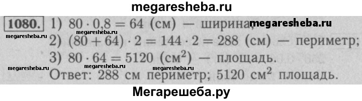 1080. Длина прямоугольника равна 80 см, его ширина составляет 80 % длины. Найдите периметр и площадь прямоугольника.