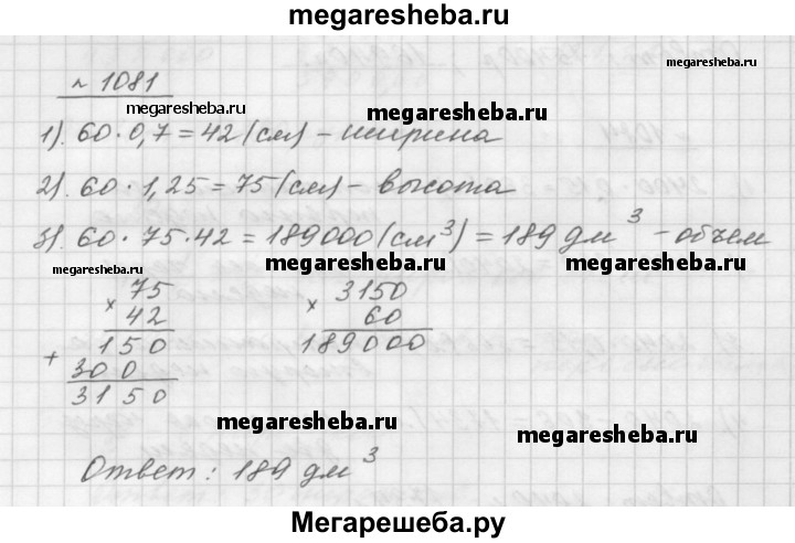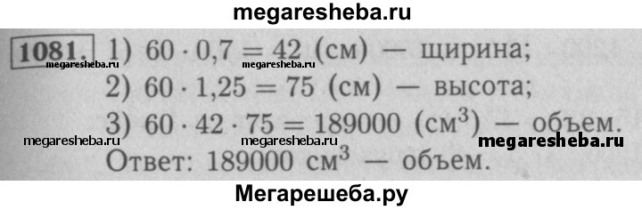 1081. Длина прямоугольного параллелепипеда равна 60 см, его ширина составляет 70 % длины, а высота — 125 % длины. Вычислите объём параллелепипеда.