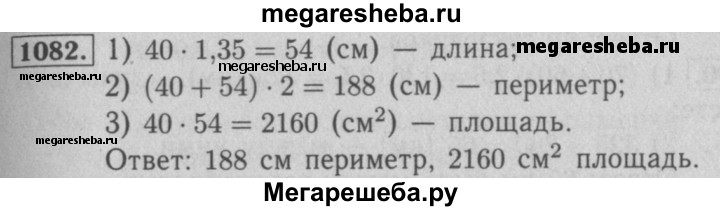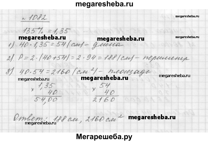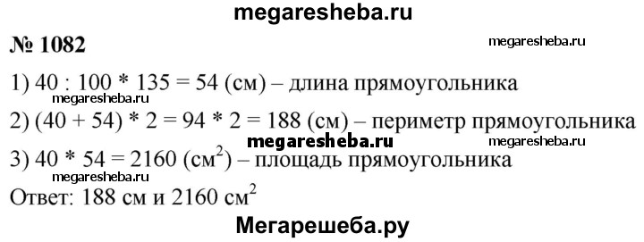 1082. Ширина прямоугольника равна 40 см, его длина составляет 135 % ширины. Найдите периметр и площадь прямоугольника.