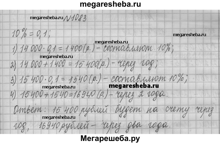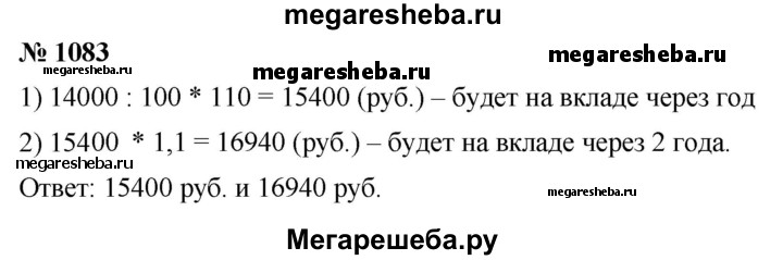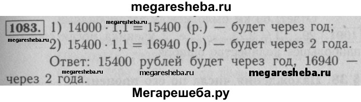 1083. Сергей Иванович положил в банк 14 000 р. под 10 % годовых. Какая сумма будет на его счёте через год? Через два года??