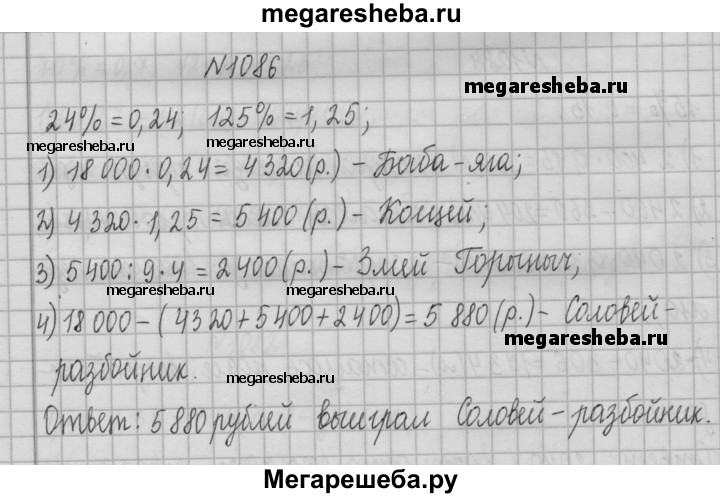 1086. Баба-яга, Кощей Бессмертный, Змей Горыныч и Соловей-разбойник выиграли в лотерею 18 000 р. Баба-яга выиграла 24 % этой суммы, Кощей — 125 % того, что выиграла Баба-яга, Змей Горыныч — 4/9 того, что выиграл Кощей, а остальное — Соловей-разбойник. Сколько рублей выиграл Соловей-разбойник?