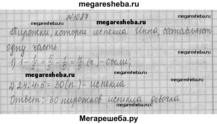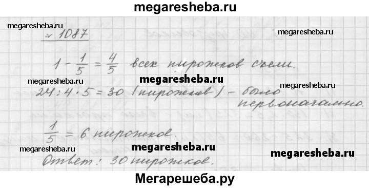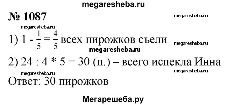 1087. Инна испекла пирожки с повидлом и угостила ими своих друзей. Они съели 24 пирожка, после чего у Инны осталась 1/5 всех пирожков. Сколько всего пирожков испекла девочка?