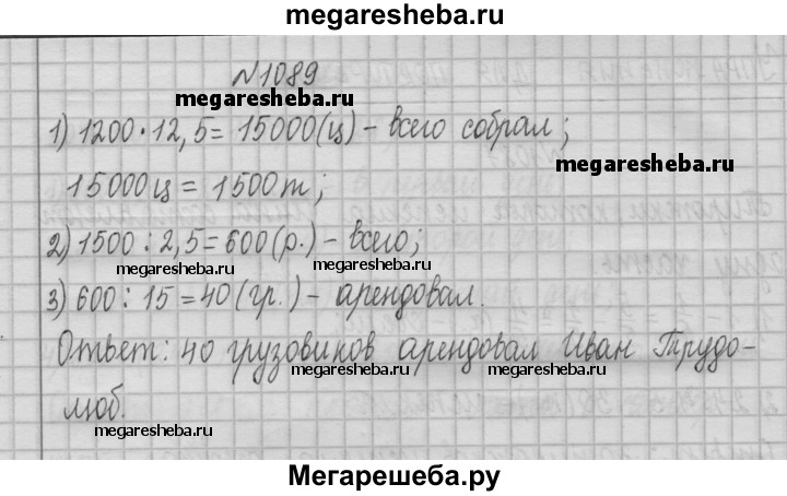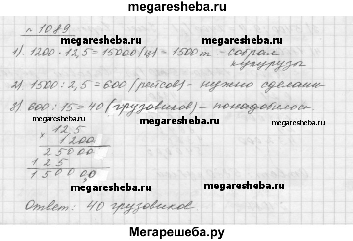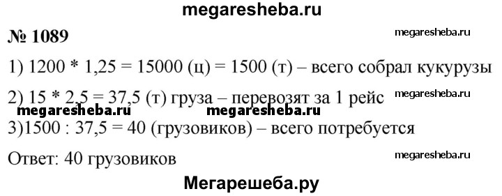 1089. Иван Трудолюб собрал по 1 200 ц кукурузы с одного гектара поля, площадь которого составляла 12,5 га. Для перевозки урожая он арендовал грузовики, каждый из которых перевозил по 2,5 т и сделал по 15 рейсов. Сколько грузовиков арендовал Иван Трудолюб?