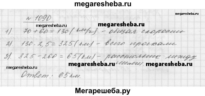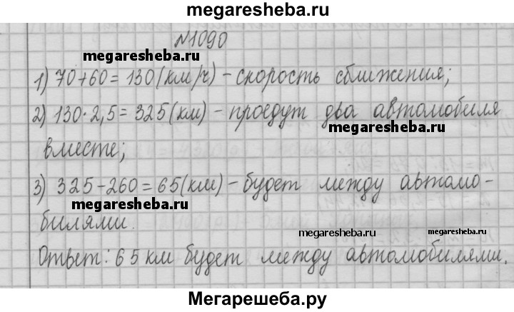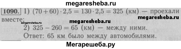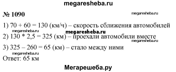 1090. Из двух пунктов, расстояние между которыми равно 260 км, навстречу друг другу одновременно выехали два автомобиля. Скорость одного автомобиля равна 70 км/ч, а скорость второго - 60 км/ч. Какое расстояние будет между автомобилями через 2,5 ч после начала движения?
