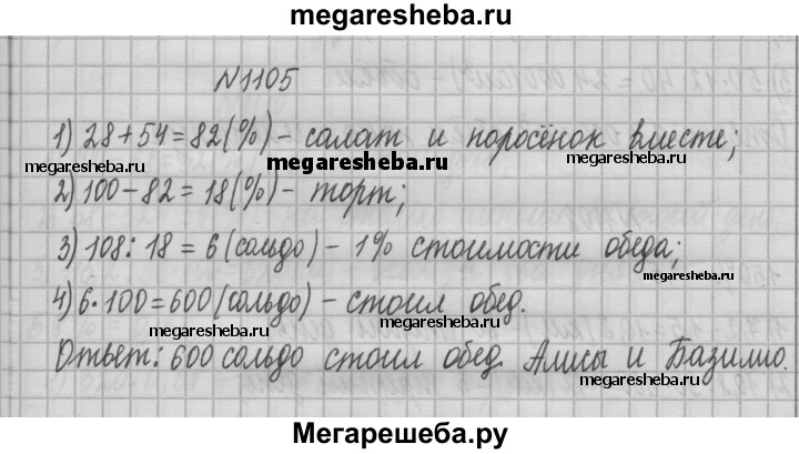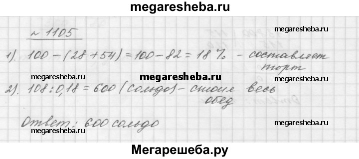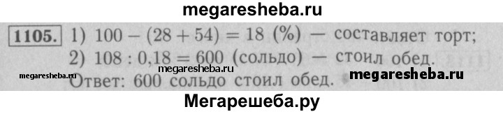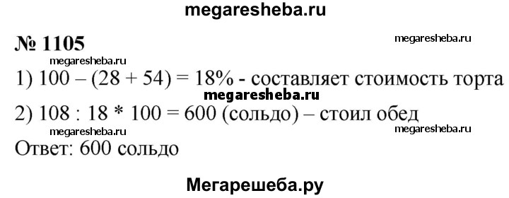 1105. На обед в харчевне «Три пескаря» лиса Алиса и кот Базилио заказали салат «Оливье», жареного поросёнка и торт-мороженое. Когда им принесли счёт, оказалось, что за салат надо заплатить 28 % суммы, за поросёнка — 54 %, а за торт — остальные 108 сольдо. Сколько сольдо стоил обед Алисы и Базилио?
