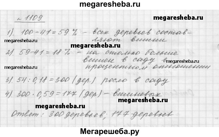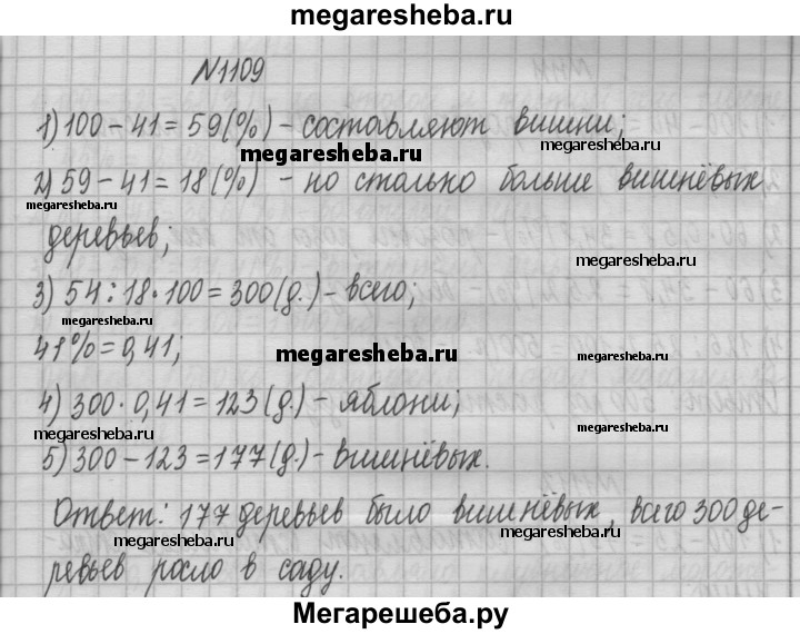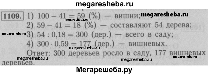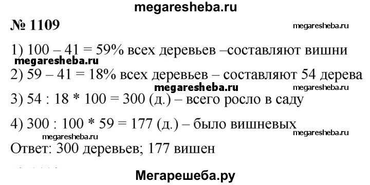1109. В саду росли яблони и вишни, причём яблони составляли 41 % всех деревьев. Вишнёвых деревьев было на 54 больше, чем яблонь. Сколько деревьев росло в саду? Сколько среди них было вишнёвых деревьев??