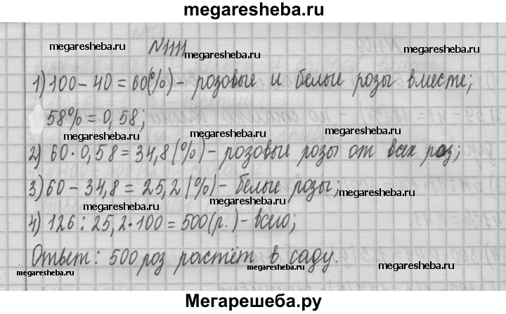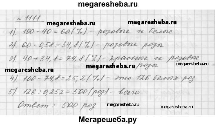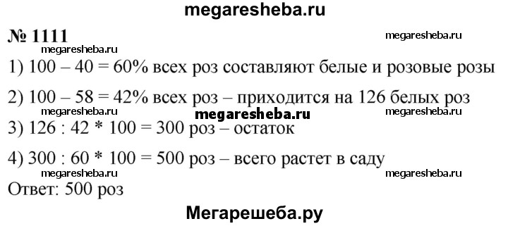 1111. В саду растут красные, розовые и белые розы. Красные розы составляют 40 % всех роз, розовые — 58 % остальных роз, а белых роз растёт 126. Сколько всего роз растёт в саду?
