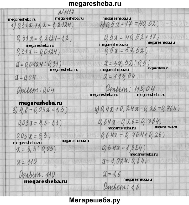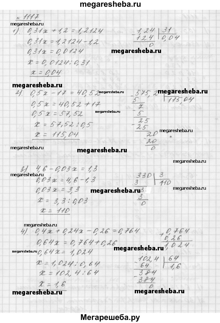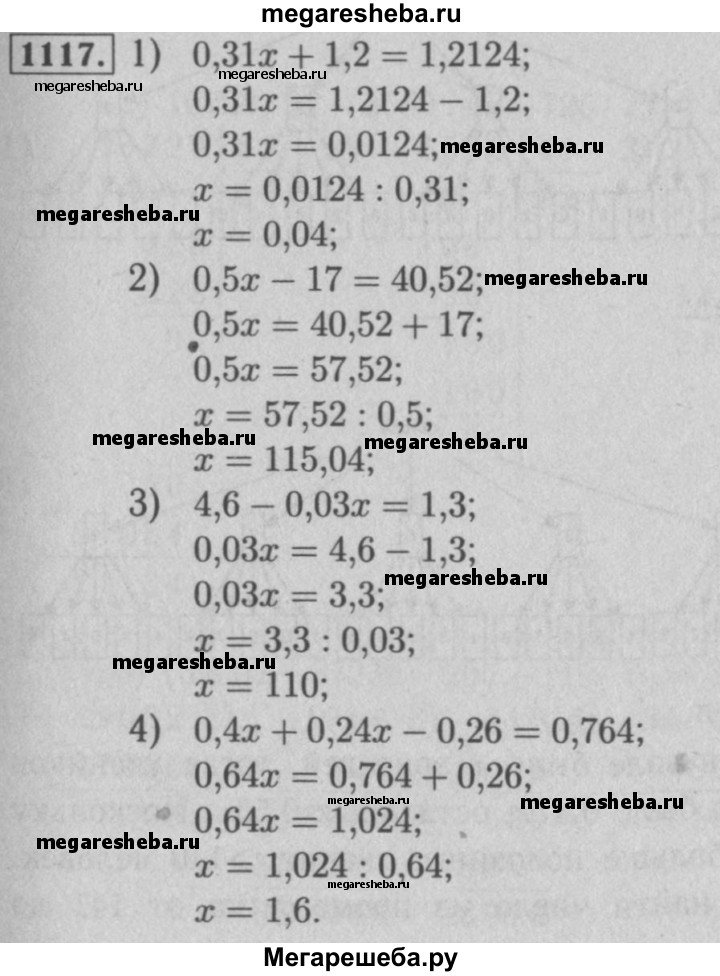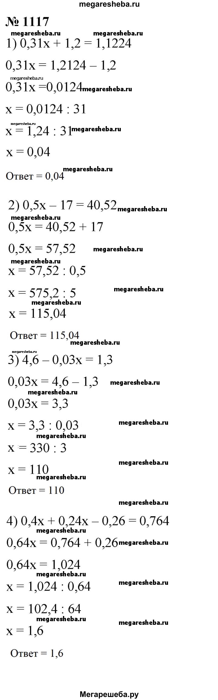 1117. Решите уравнение: 1) 0,31 х + 1,2 = 1,2124; 2) 0,5 х - 17 = 40,52; 3) 4,6-0,03 х = 1,3; 4) 0,4 х + 0,24 х - 0,26 = 0,764.