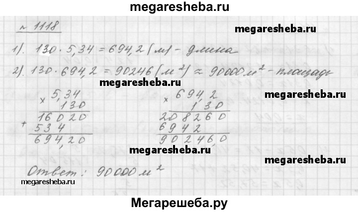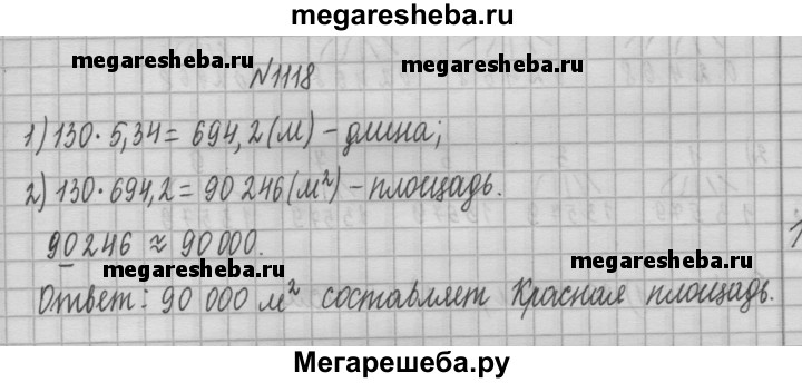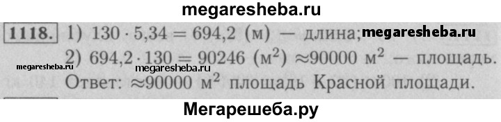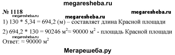 1118. Ширина Красной площади в Москве равна 130 м. Длина её в 5,34 раза больше ширины. Сколько квадратных метров составляет её площадь? Ответ округлите до тысяч.