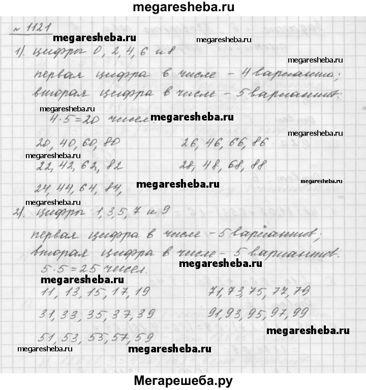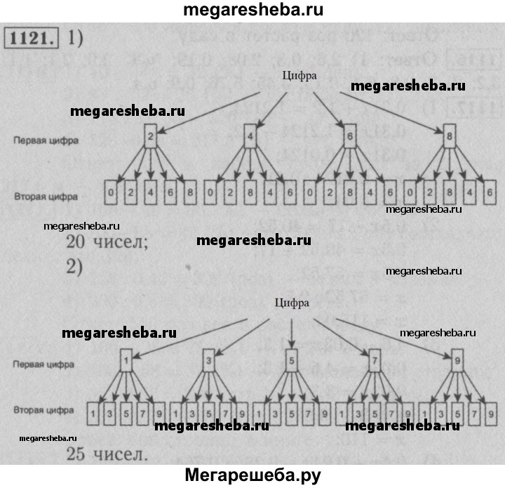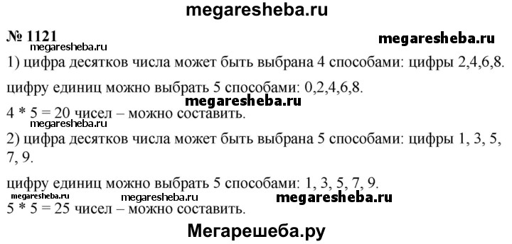 1121. Сколько существует двузначных чисел, для записи которых используются только: 1) цифры 0, 2, 4, 6 и 8; 2) цифры 1, 3, 5, 7 и 9? (Цифры могут повторяться.)