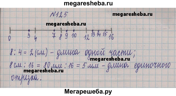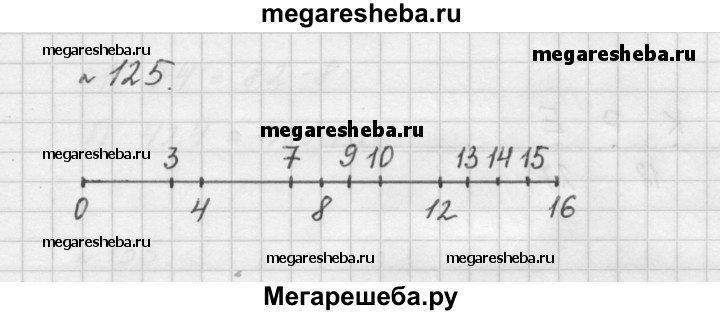 125. Начертите отрезок длиной 8 см. Над одним концом отрезка напишите число 0, а над другим — 16. Разделите отрезок на четыре равные части. Назовите числа, которые соответствуют каждому штриху деления. Отметьте на полученной шкале числа 3, 7, 9, 10, 13, 14, 15.