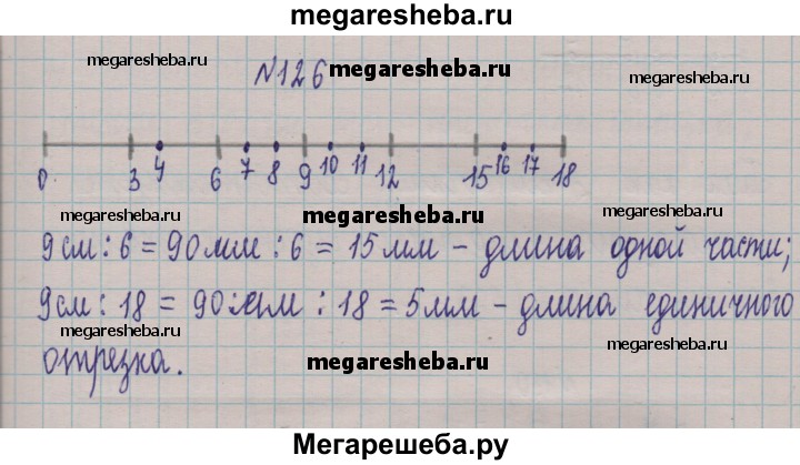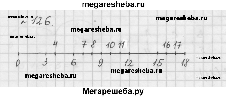 126. Начертите отрезок длиной 9 см. Над одним концом отрезка напишите число 0, а над другим — 18. Разделите отрезок на шесть равных частей. Назовите числа, которые соответствуют каждому штриху деления. Отметьте на полученной шкале числа 4, 7, 8, 10, 11, 16, 17.