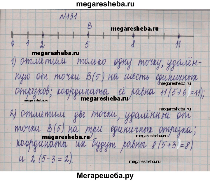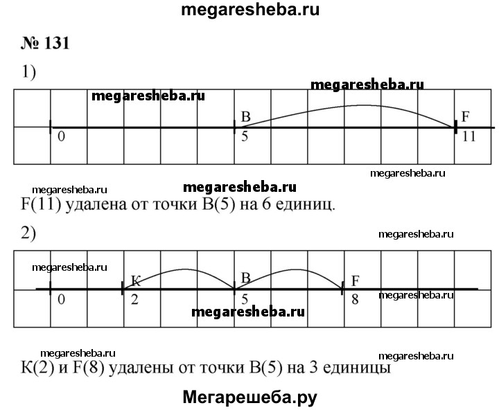 131. Начертите координатный луч и отметьте на нём точку, удалённую от точки В (5) на: 1) шесть единичных отрезков; 2) три единичных отрезка.