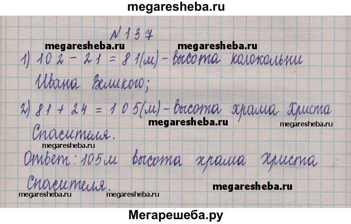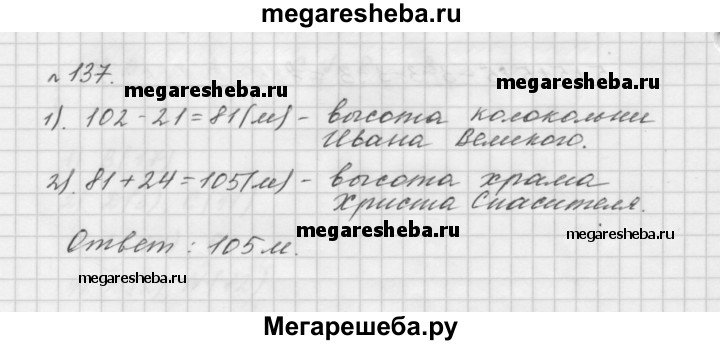 137. Высота Исаакиевского собора (г. Санкт-Петербург) равна 102 м, что на 21 м больше высоты колокольни Ивана Великого на территории Московского Кремля. Высота колокольни Ивана Великого на 24 м меньше высоты храма Христа Спасителя в Москве. Какова высота храма Христа Спасителя?