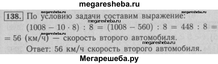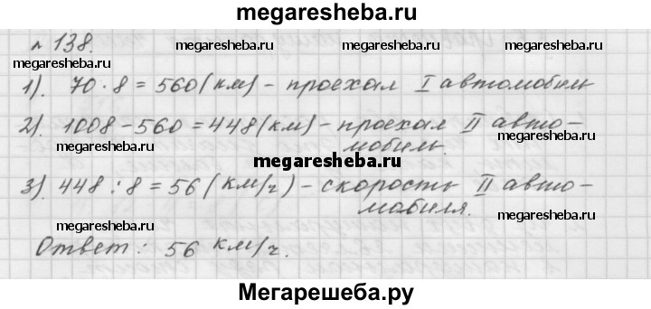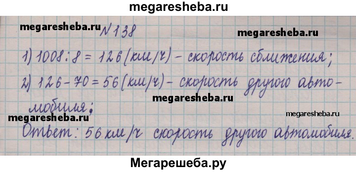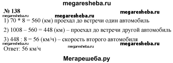 138. Из двух городов, расстояние между которыми равно 1 008 км, выехали одновременно навстречу друг другу два автомобиля и встретились через 8 ч после начала движения. Скорость одного автомобиля 70 км/ч. Найдите скорость другого автомобиля.