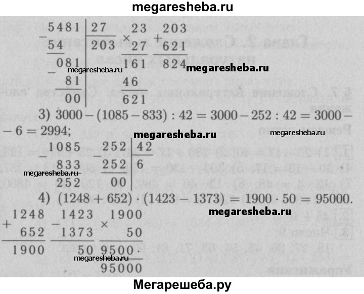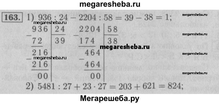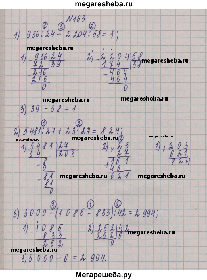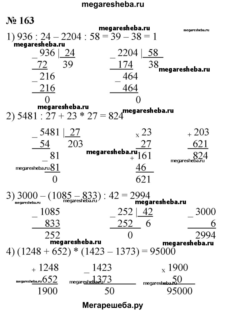 163. Вычислите: 1) 936 : 24 – 2 204 : 58; 2) 5 481 : 27 + 23 • 27; 3) 3 000 – (1 085 – 833) : 42; 4) (1 248 + 652) • ( 1 423 – 1 373).