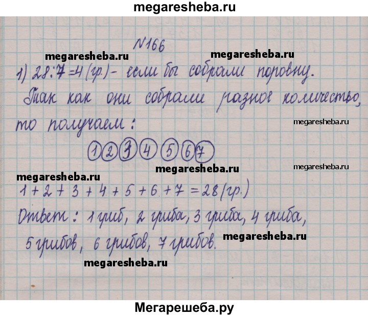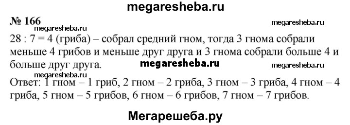 166. Семь гномов собрали вместе 28 грибов. Все они собрали разное количество грибов, и ни у кого не оказалось пустой корзинки. Сколько грибов собрал каждый гном?
