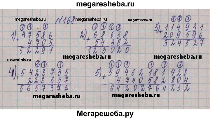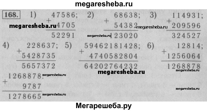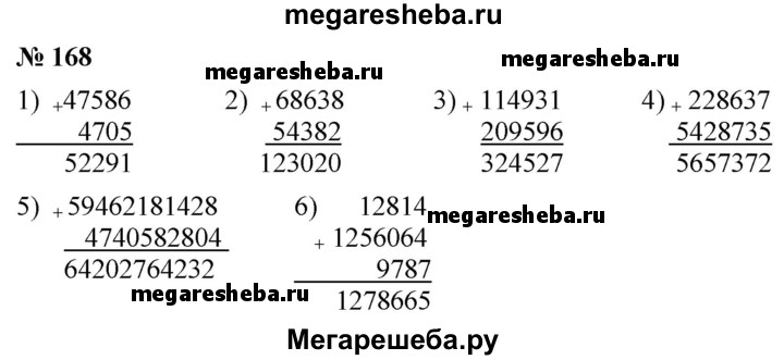 168. Выполните сложение: 1) 47 586 + 4 705; 2) 68 638 + 54 382; 3) 114 931 + 209 596; 4) 228 637 + 5 428 735; 5) 59 462 181 428 + 4 740 582 804; 6) 12 814 + 1 256 064 + 9 787.