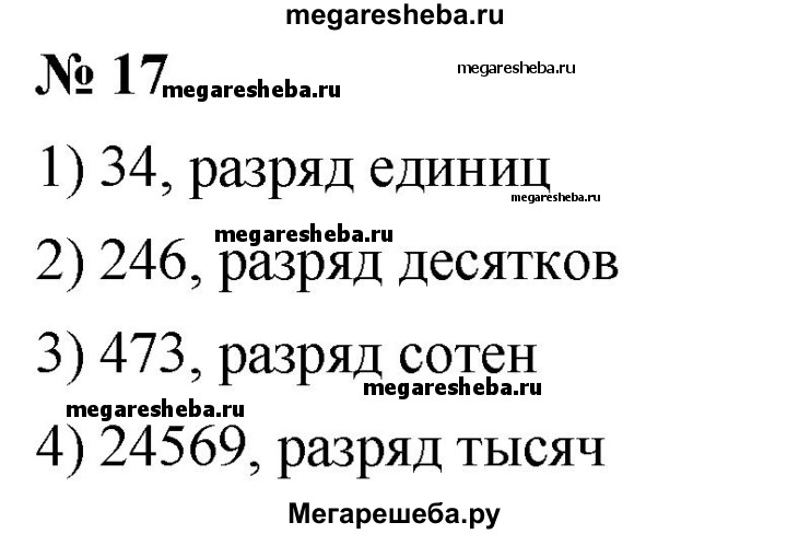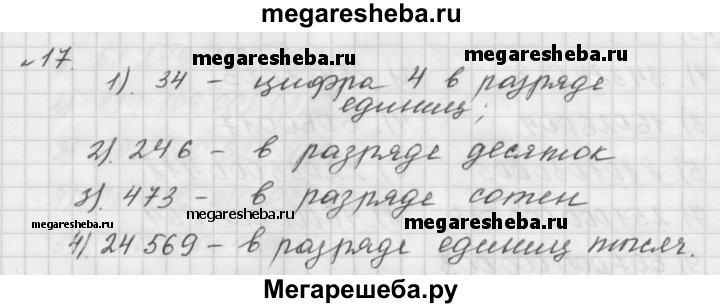17. Назовите разряд, в котором стоит цифра 4 в записи числа: 1) 34; 2) 246; 3) 473; 4) 24 569.
