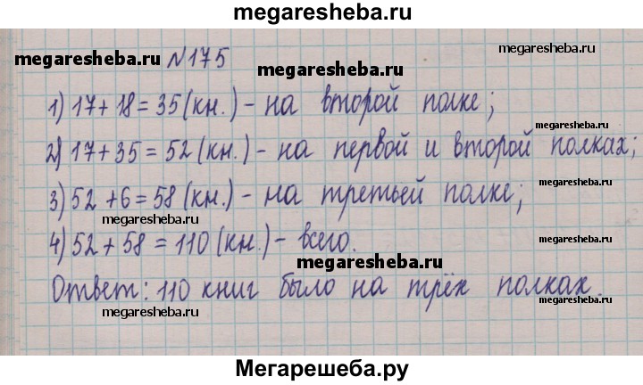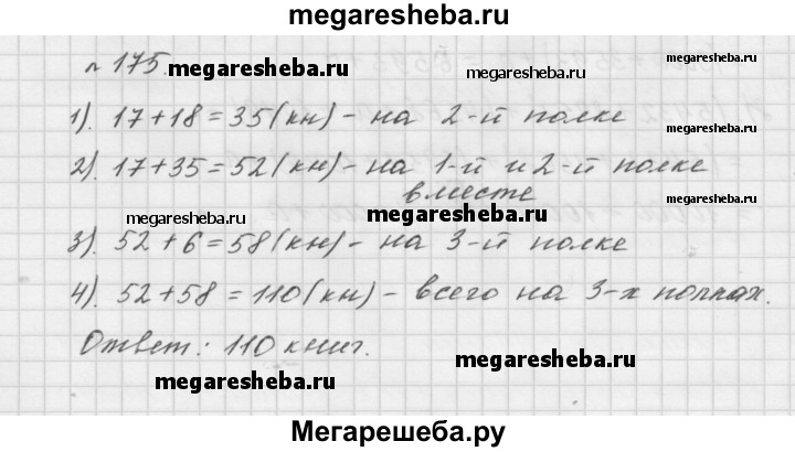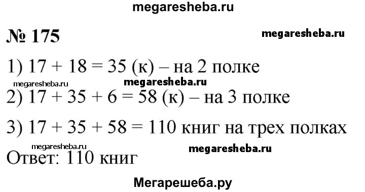 175. На одной полке было 17 книг, на второй — на 18 книг больше, чем на первой, а на третьей — на 6 книг больше, чем на первой и второй вместе. Сколько всего книг было на трёх полках?