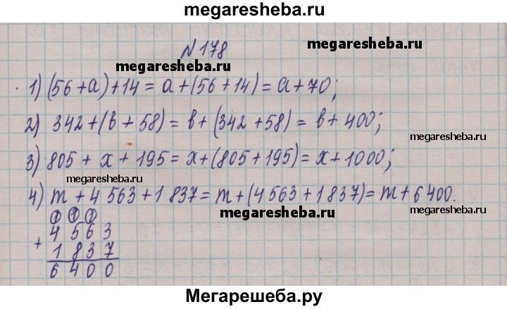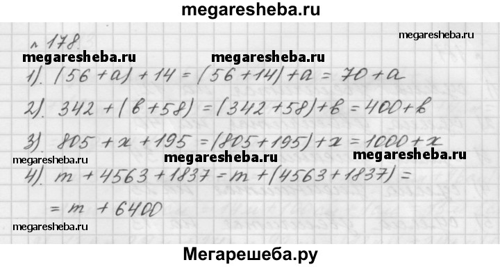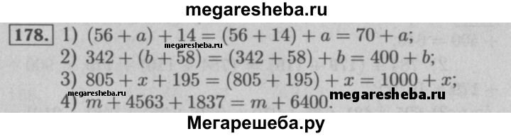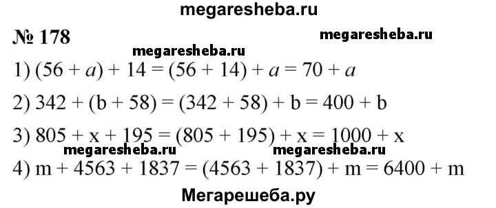 178. Упростите выражение: 1) (56 + а) + 14; 2) 342 + (b + 58); 3) 805 + х + 195; 4) m + 4 563 + 1 837.