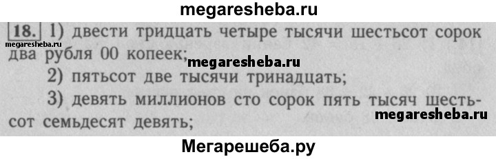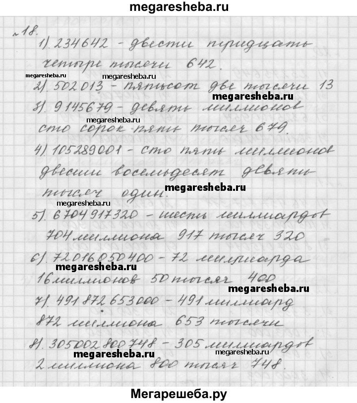 18. Прочитайте число: 1) 234 642; 2) 502 013; 3) 9 145 679; 4) 105 289 001; 5) 6 704 917 320; 6) 72 016 050 400; 7) 491 872 653 000; 8) 305 002 800 748.