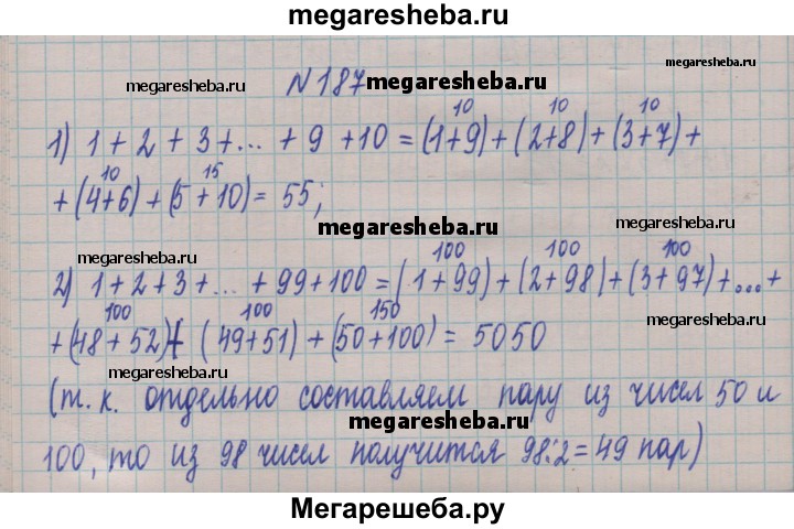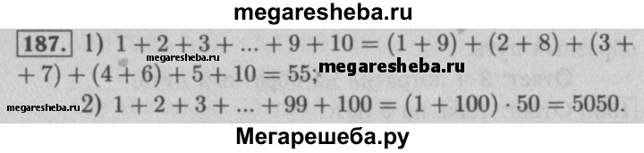 187. Найдите сумму наиболее удобным способом: 1) 1 + 2 + 3 + ... + 9 + 10; 2) 1 + 2 + 3 + ... + 99 + 100.