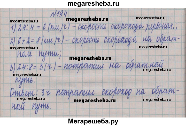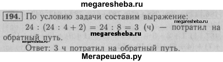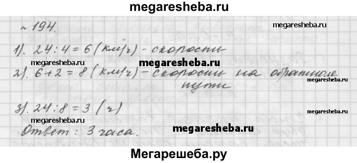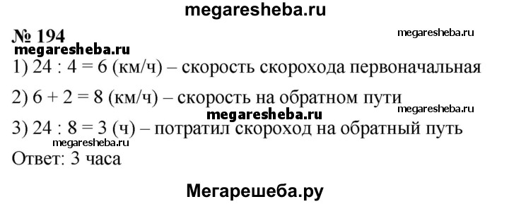 194. Скороход прошёл 24 км за 4 ч. На обратном пути он увеличил скорость на 2 км/ч. Сколько времени он потратил на обратный путь?