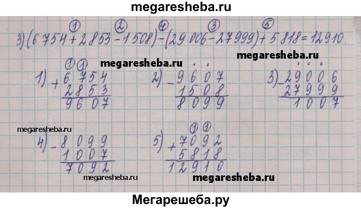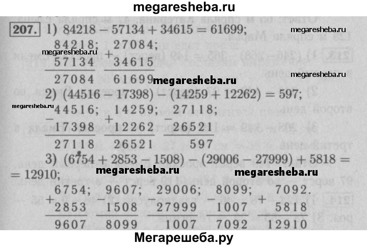 207. Вычислите: 1) 84 218- 57 134 + 34 615; 2) (44 516 - 17 398) - (14 259 + 12 262); 3) (6 754 + 2 853 - 1 508) - (29 006 - 27 999) + 5 818.