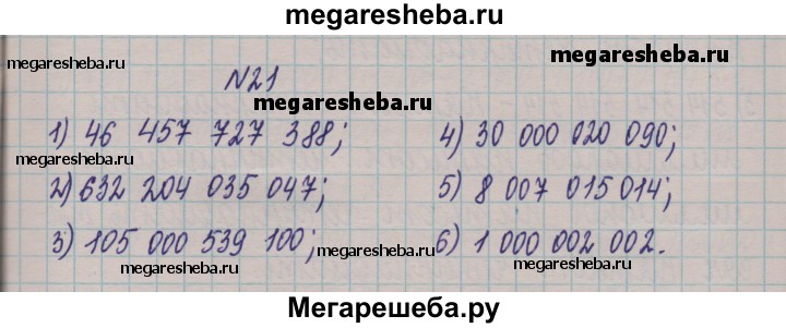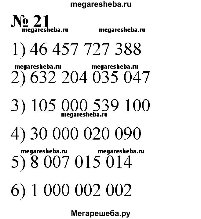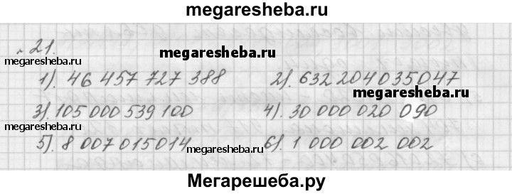 21. Запишите десятичной записью число: 1) сорок шесть миллиардов четыреста пятьдесят семь миллионов семьсот двадцать семь тысяч триста восемьдесят восемь; 2) шестьсот тридцать два миллиарда двести четыре миллиона тридцать пять тысяч сорок семь; 3) сто пять миллиардов пятьсот тридцать девять тысяч сто; 4) тридцать миллиардов двадцать тысяч девяносто; 5) восемь миллиардов семь миллионов пятнадцать тысяч четырнадцать; 6) один миллиард две тысячи два.