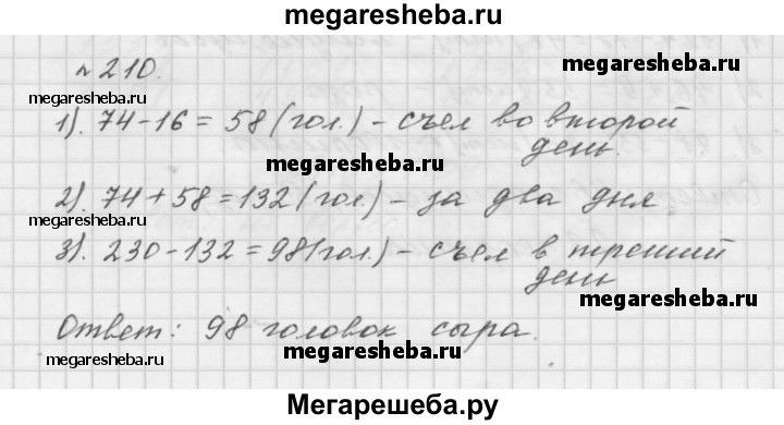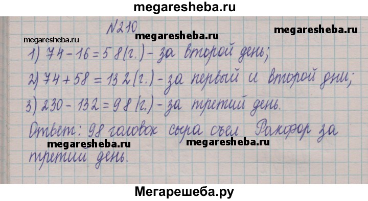 210. За три дня Рокфор съел 230 головок сыра. За первый день он съел 74 головки, что на 16 головок больше, чем за второй. Сколько головок сыра съел Рокфор за третий день?