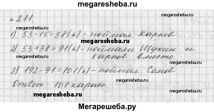 211. Щукин, Карпов и Сомов отправились на рыбалку. Вместе они поймали 192 карася, причём Щукин поймал 53 карася, что на 15 больше, чем поймал Карпов. Сколько карасей поймал Сомов?