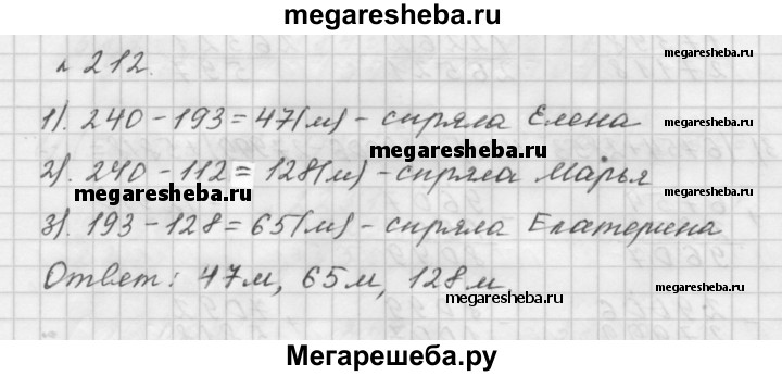 212. Царевны Елена, Катерина и Марья пряли пряжу. У Елены и Катерины получилось вместе 112 м пряжи, а у Катерины и Марьи — 193 м. Сколько метров пряжи спряла каждая царевна, если всего её получилось 240 м?