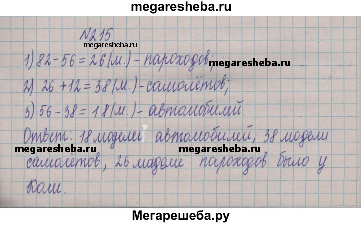 215. Коля собирал модели автомобилей, самолётов и пароходов, причём автомобилей и самолётов у него было 56 моделей, а самолётов — на 12 моделей больше, чем пароходов. Сколько моделей каждого вида было у Коли, если всего его коллекция насчитывала 82 модели?