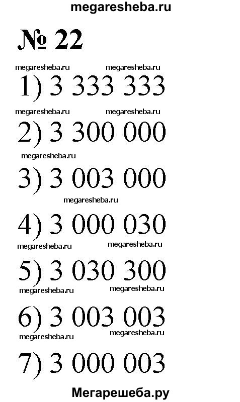 22. Запишите десятичной записью число: 1) три миллиона триста тридцать три тысячи триста тридцать три; 2) три миллиона триста тысяч; 3) три миллиона три тысячи; 4) три миллиона тридцать; 5) три миллиона тридцать тысяч триста; 6) три миллиона три тысячи три; 7) три миллиона три.