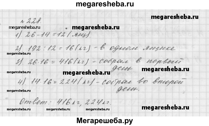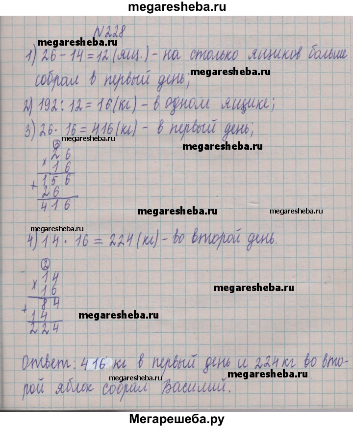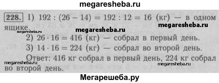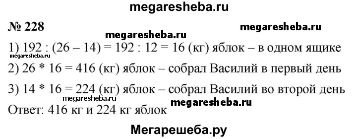 228. В первый день Василий собрал в своём саду 26 ящиков яблок, а во второй — 14 таких же ящиков яблок. Сколько килограммов яблок собрал Василий в первый день и сколько — во второй, если во второй день он собрал на 192 кг меньше, чем в первый?