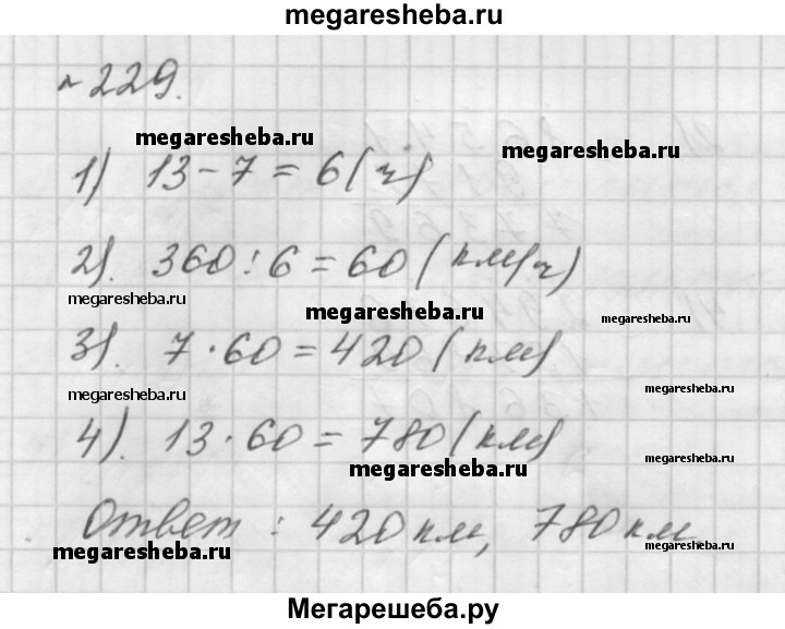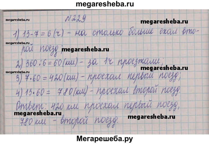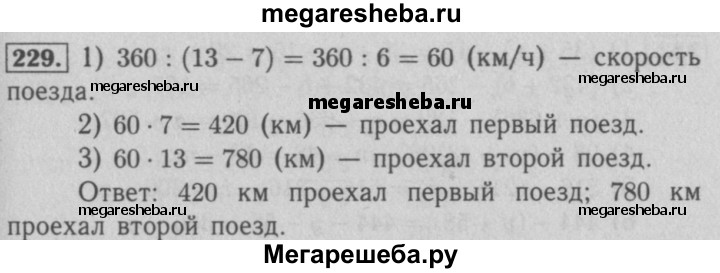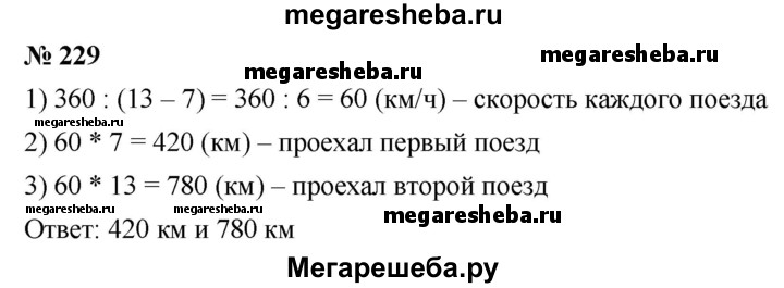 229. Один поезд находился в пути 7 ч, а второй — 13 ч. Второй поезд проехал на 360 км больше, чем первый. Сколько километров проехал каждый поезд, если они двигались с одинаковой скоростью?