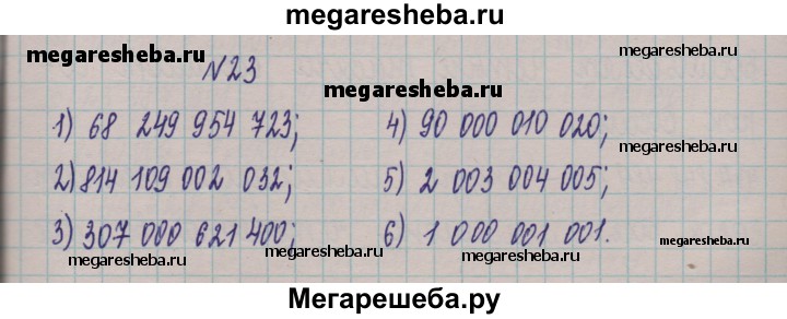 23. Запишите десятичной записью число: 1) шестьдесят восемь миллиардов двести сорок девять миллионов девятьсот пятьдесят четыре тысячи семьсот двадцать три; 2) восемьсот четырнадцать миллиардов сто девять миллионов две тысячи тридцать два; 3) триста семь миллиардов шестьсот двадцать одна тысяча четыреста; 4) девяносто миллиардов десять тысяч двадцать; 5) два миллиарда три миллиона четыре тысячи пять; 6) один миллиард одна тысяча один.