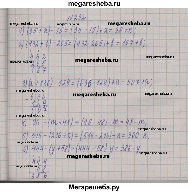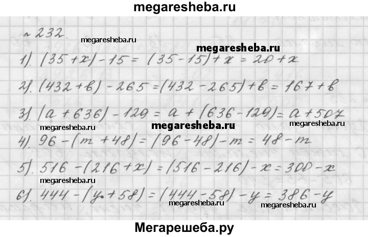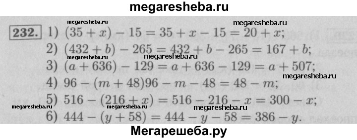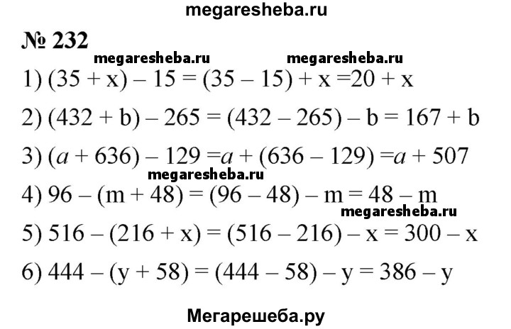 232. Упростите выражение: 1) (35+х)- 15; 2) (432 + b) - 265; 3) (a+ 636)- 129; 4) 96 - (m + 48); 5) 516 - (216+ х); 6) 444 - (у + 58).