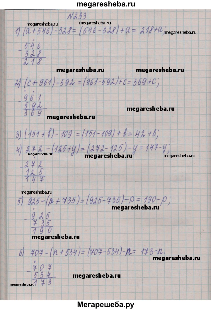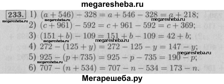 233. Упростите выражение: 1) (а + 546) - 328; 2) (с + 961) -592; 3) (151 +b)- 109; 4) 272-(125 + у); 5) 925-(p + 735); 6) 707-(n + 534).