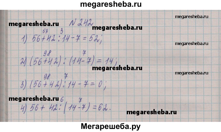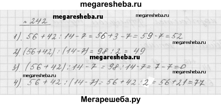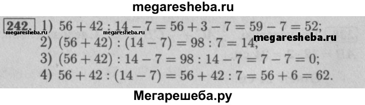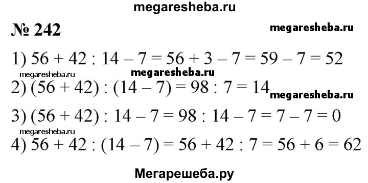 242. Найдите значение выражения: 1) 56 + 42 : 14 - 7; 2) (56 + 42) : (14 - 7); 3) (56 + 42) : 14 - 7; 4) 56 + 42 : (14 - 7).