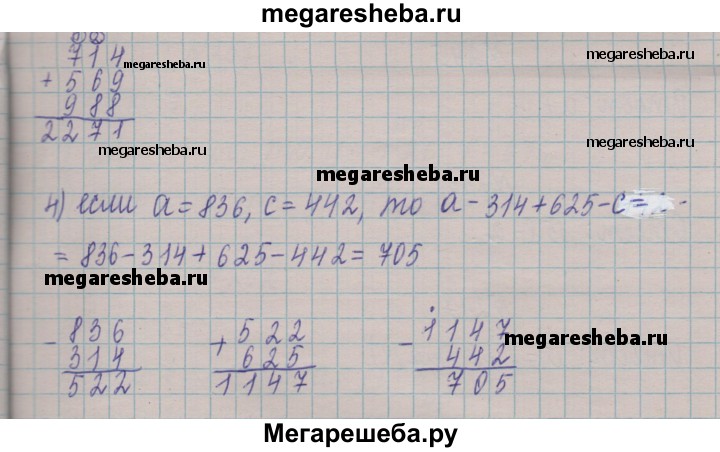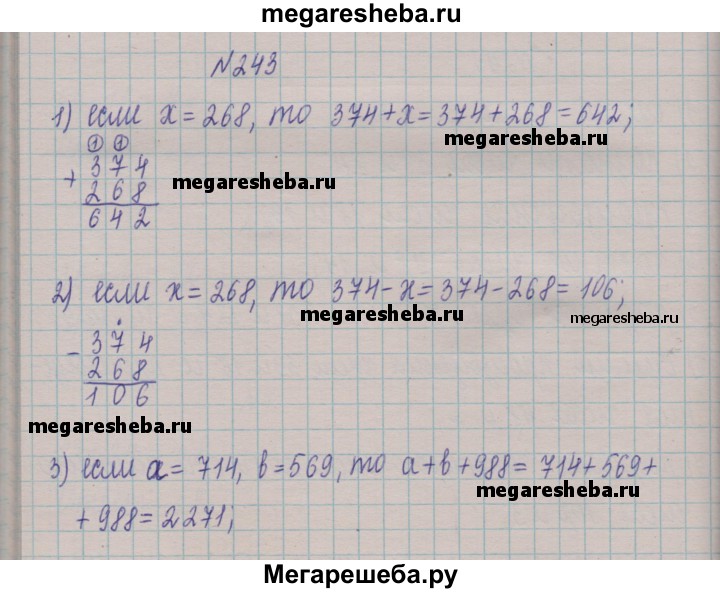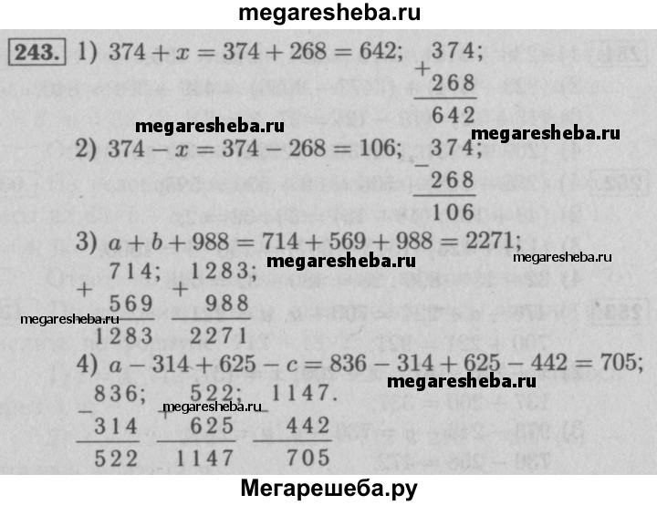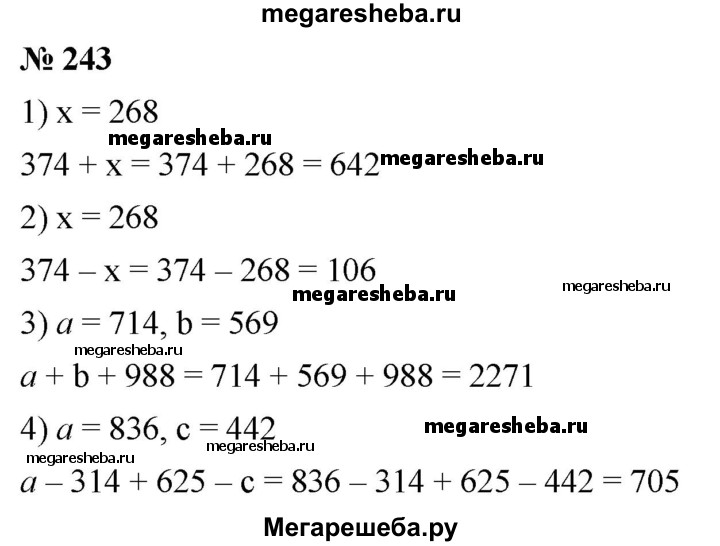 243. Найдите значение выражения: 1) 374 +х, если х — 268; 2) 374 -х, если х — 268; 3) а + b + 988, если а = 714, b = 569; 4) а - 314 + 625 - с, если а = 836, с = 442.