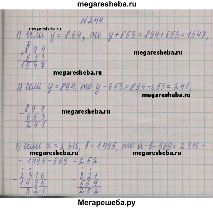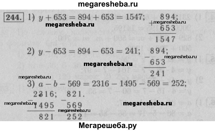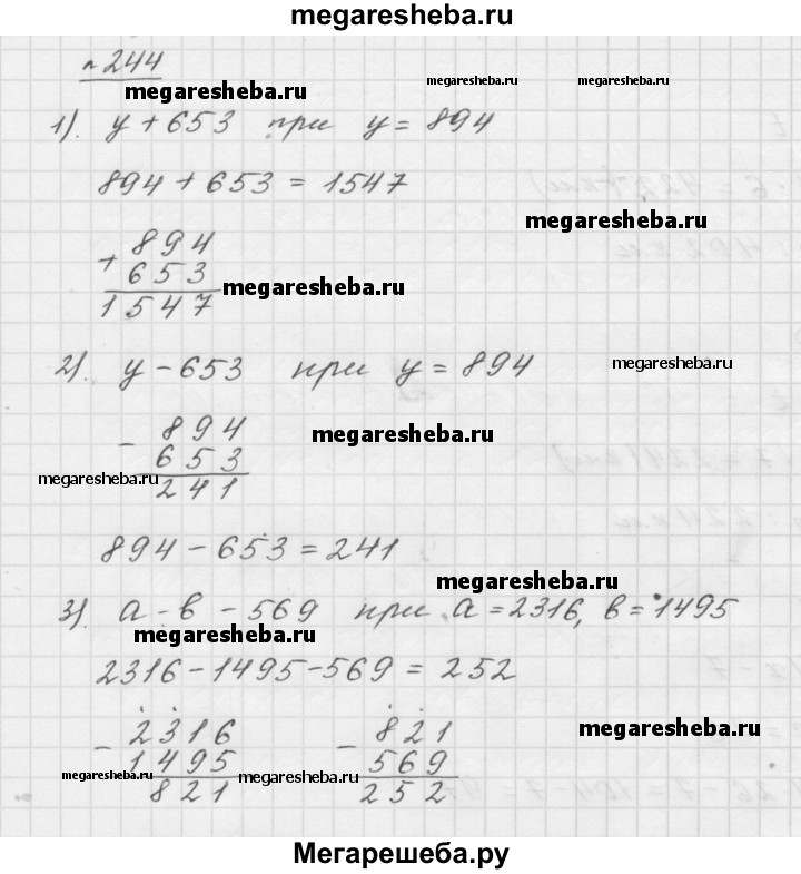 244. Найдите значение выражения: 1) у + 653, если у = 894; 2) у - 653, если у = 894; 3) а-b - 569, если a = 2 316, b= 1 495.