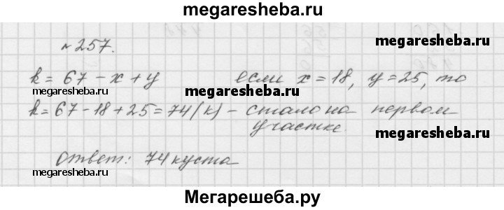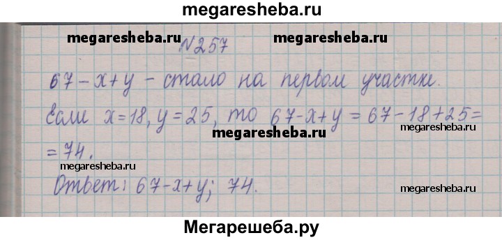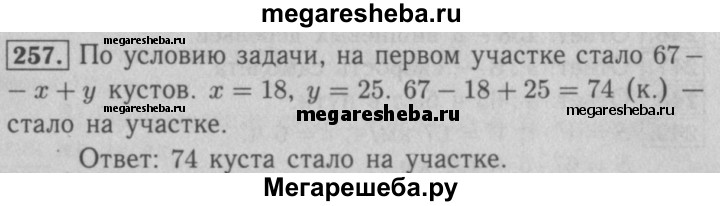 257. На первом участке росло 67 кустов смородины Потом х кустов пересадили на второй участок, а на первый посадили у новых кустов. Сколько кустов стало на первом участке? Вычислите значение полученного выражения, если х = 18, у = 25.