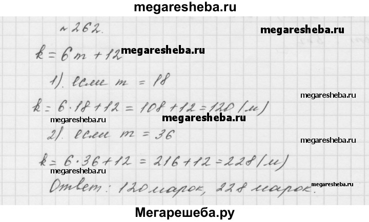 262. Илья разложил по m марок в каждый из шести альбомов, и ещё 12 марок у него осталось. Составьте формулу для вычисления количества марок, которые есть у Ильи, и вычислите это количество, если: 1) m = 18; 2) m = 36.