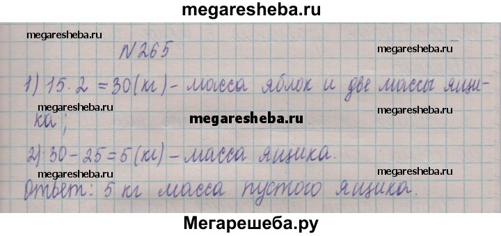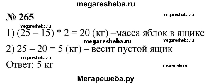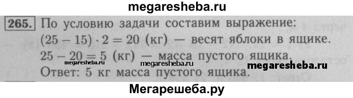 265. Масса полного ящика с яблоками составляет 25 кг. После того как продали половину яблок, масса ящика с оставшимися яблоками оказалась равной 15 кг. Какова масса пустого ящика?