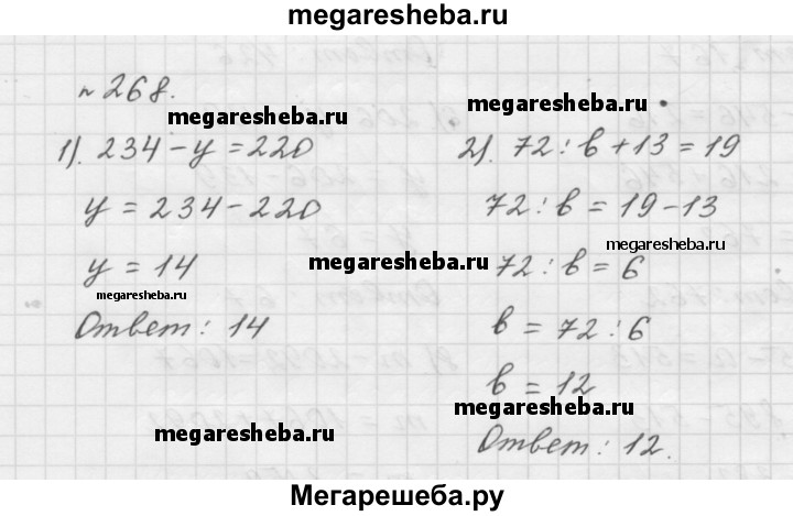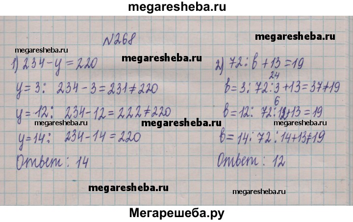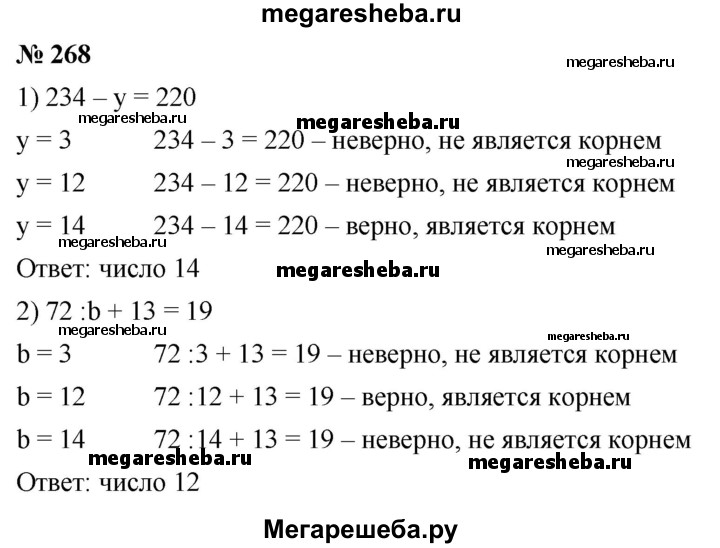 268. Какое из чисел 3, 12, 14 является корнем уравнения: 1) 234-у= 220; 2) 72 : b + 13 = 19?