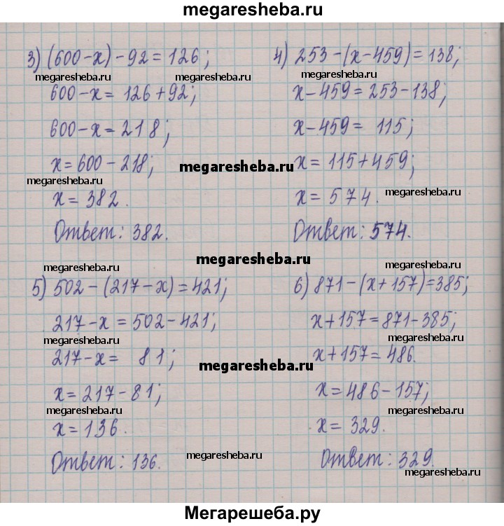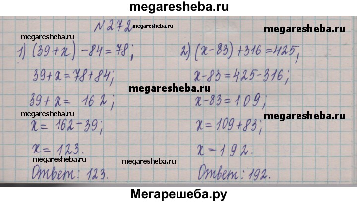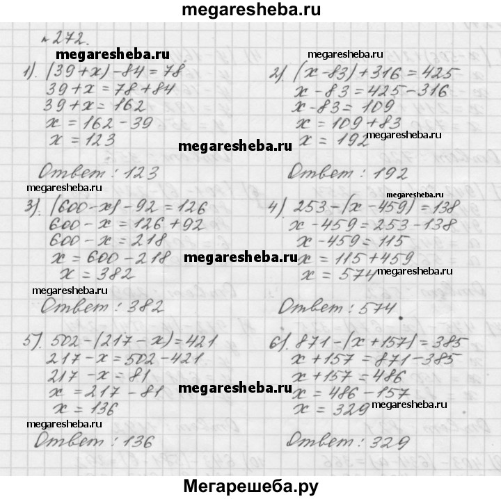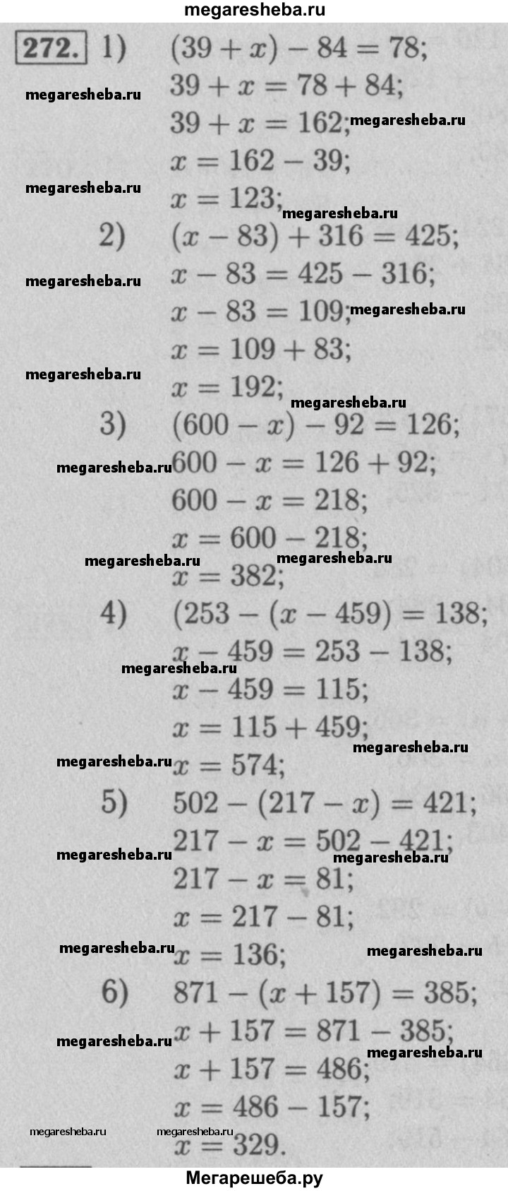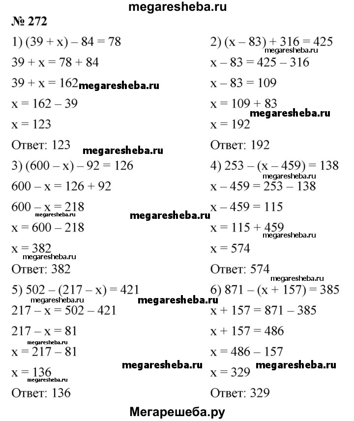 272. Решите уравнение: 1) (39 +x ) - 84 = 78; 2) (x - 83) + 316 = 425; 3) (600- x)-92 = 126; 4) 253 - (x - 459) = 138; 5) 502 - (217 - х) = 421; 6) 871 - (х + 157) = 385.