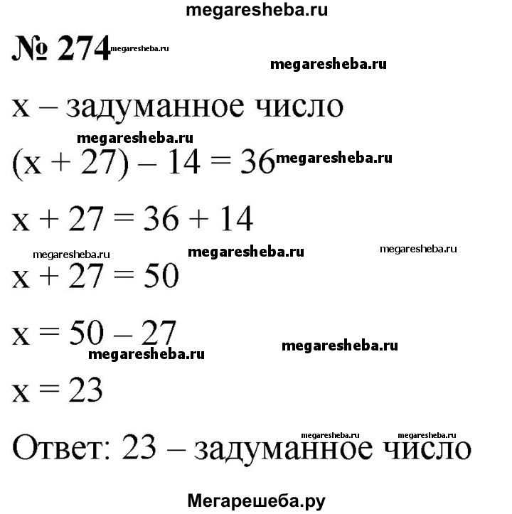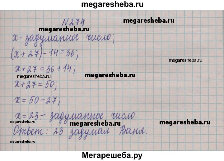 274. Решите с помощью уравнения задачу. Ваня задумал число. Если к этому числу прибавить 27 и из полученной суммы вычесть 14, то получим число 36. Какое число задумал Ваня?